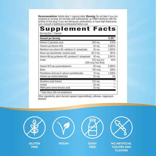 Vegan B-Stress Formula with Vitamins C, B12, B6 - Supports Cellular Energy & Nerve Function - Gluten Free - 100 Capsules