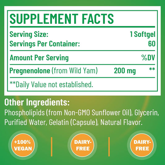 High Absorption 200 mg Pregnenolone Capsules for Memory and Focus | Wild Yam Extract | Gluten-Free, Non-GMO | 120 Count