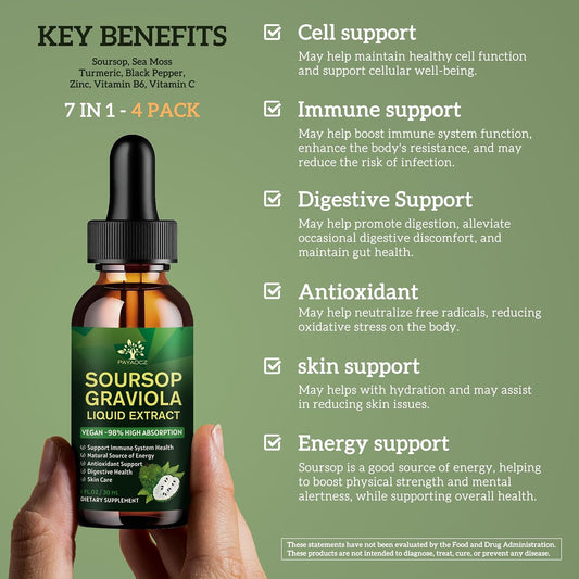 Soursop Graviola Liquid, Drops, and Capsules for Cell Regeneration, Immunity Boost, and Antioxidant Support - Gluten Free and Non GMO Vegan Options
