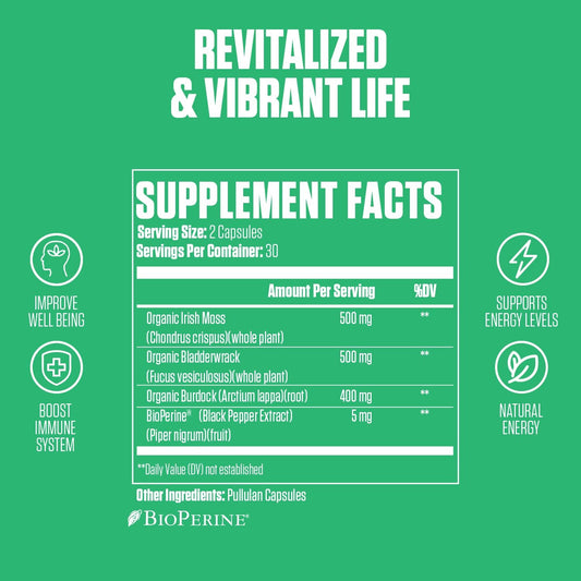 Organic Sea Moss Supplement with Bladderwrack, Burdock & BioPerine | Boost Energy and Immune Health with All-Natural Irish Sea Moss Capsules | Vegan-Friendly - 60 Count