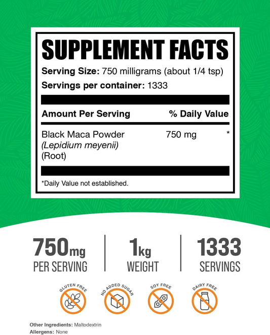 Black Maca Root Powder - 1kg (2.2 lbs) - Vegan Maca Supplement - Gluten Free - 750mg per Serving - Raw Black Maca for Men & Women