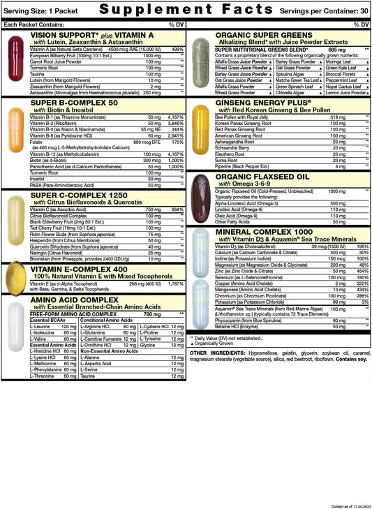 Daily Vitamin Pack for Energy & Stress Support | Vitamin A, B, C, D, E, B12, Minerals, Amino Acids, Omega-3-6-9, Panax Ginseng, Super Greens | 30 Packets