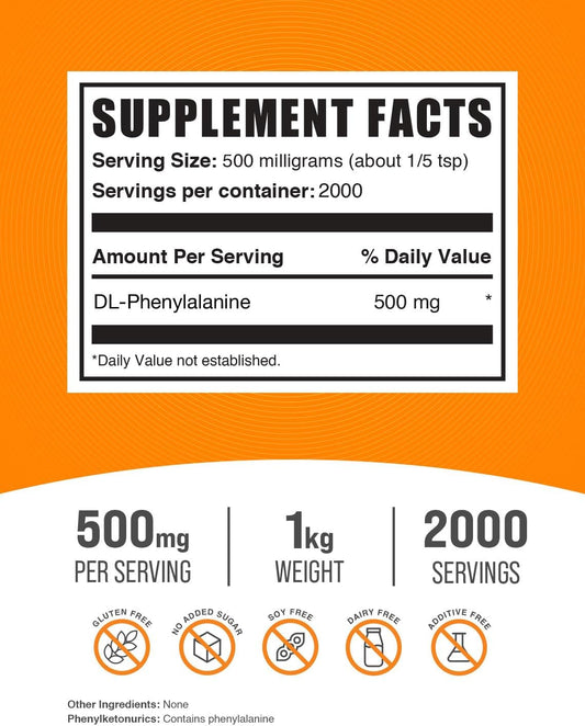 BulkSupplements.com DL-Phenylalanine Powder 1kg - DLPA Supplements, Amino Acid 500mg per Serving - Gluten Free Amino Acid Supplement