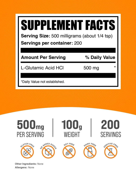 BulkSupplements.com L-Glutamic Acid HCl Powder - Amino Acid Supplement for Gut Health - Gluten Free, 500mg per Serving - 100g (3.5 oz) - Single Pack