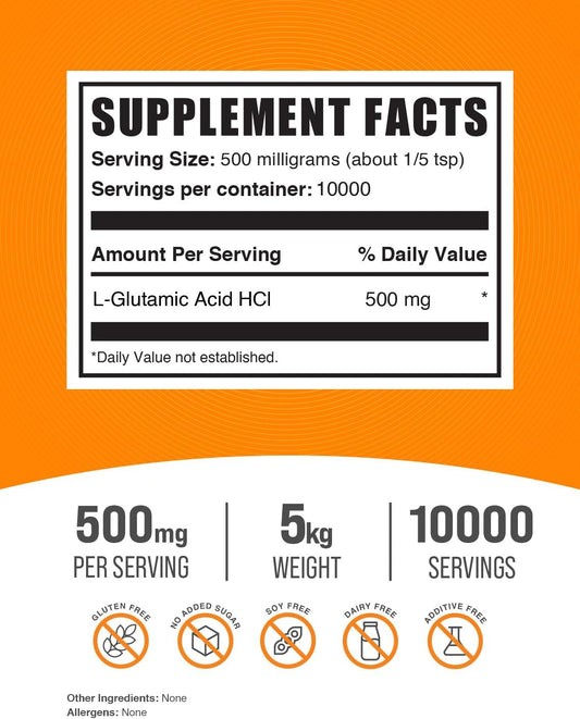 BulkSupplements L-Glutamic Acid HCl Powder - Brain Health Amino Acid Supplement - 500mg per Serving, Pack of 5 (5kg)