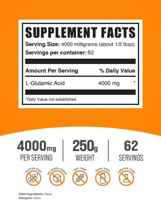 Pure L-Glutamic Acid Powder - Amino Acid Supplement for Gut Health - Gluten Free, 4000mg per Serving, 250g - BulkSupplements.com