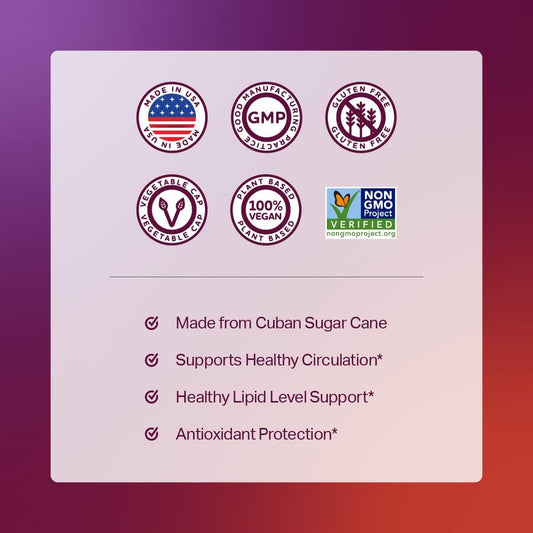 40mg Policosanol Supplement for Healthy Lipid Levels & Circulation - Cuban Sugarcane, Non-GMO, Gluten-Free Veggie Capsules - 120 Count