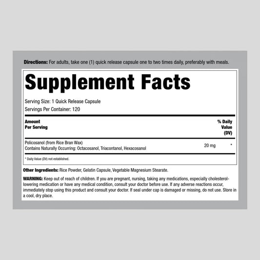 Lindberg Policosanol 20mg Capsules - Extra Strength Non GMO Gluten Free Supplement in 120 Count Bottle