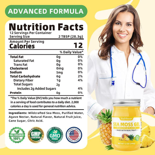12 OZ Pineapple Flavored Sea Moss Gel - Organic Wildcrafted Irish Sea Moss with 92 Minerals and Vitamins - Vegan Non-GMO Gluten-Free Supplement for Immune, Thyroid, Digestive Health