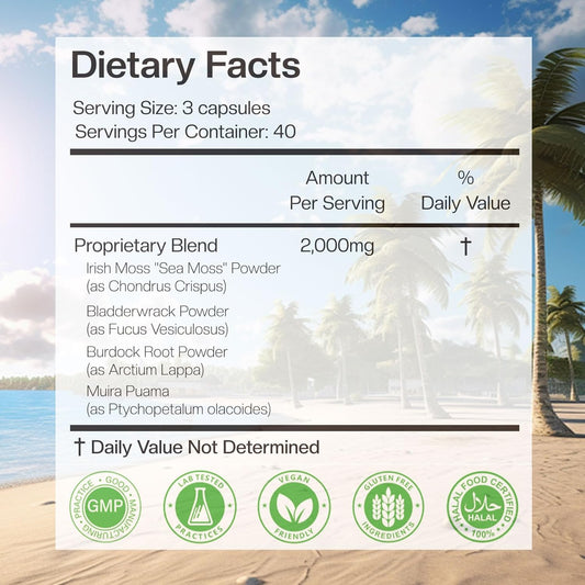 Organic Sea Moss Capsules 2000mg with Vitamin D3 K2 - Irish Sea Moss, Burdock Root, Bladderwrack, Muira Puama - 120 Capsules