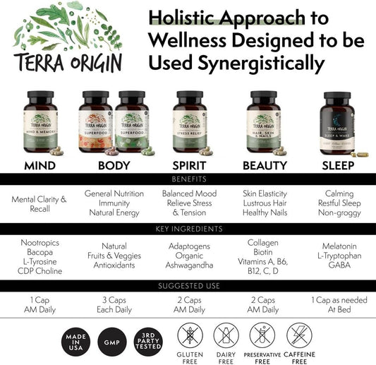 TERRA ORIGIN Hair, Skin & Nails Vitamins | 60 Capsules | Gluten Free, Non GMO | USA Made | 5,000 mcg Biotin, 200 mg Collagen | Vitamins A, C, D, B6, B12