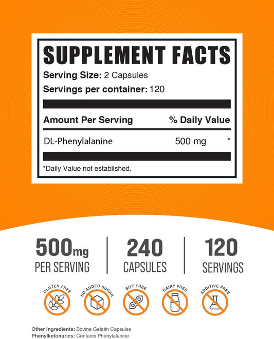 BulkSupplements.com DL-Phenylalanine 500mg Capsules - DLPA Supplements, Gluten Free - 240 Capsules
