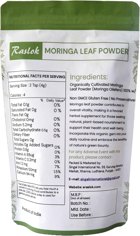 Premium Raslok Moringa Leaf Powder - 100% Pure Moringa Olifera Powder (3.52 Oz) - Stem-Free Formula