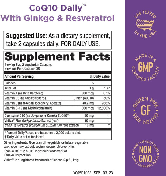 Purity Products CoQ10 Daily Super Boost with Ginkgo, Resveratrol - 60 Vegetarian Capsules for Energy and Brain Health