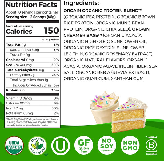 Orgain Birthday Cake Vegan Protein Powder - 21g Plant Protein, 7g Fiber, Low Net Carb, Non-GMO, No Added Sugar - 1.02 lb