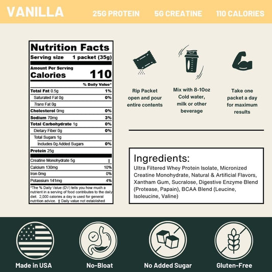 Vanilla Whey Protein Powder with Creatine - 25g Protein, 5g Creatine - Single-Serve Packets for Travel - Gluten-Free, No Added Sugar - 15-Pack