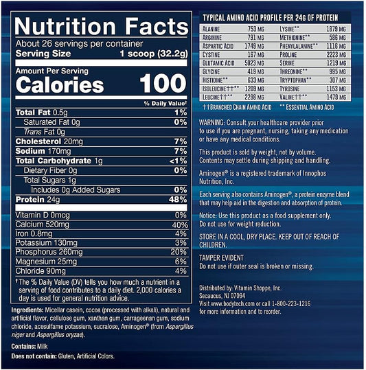 Rich Chocolate Micellar Casein Protein Powder - 24g Protein per Serving - Slow Release for Overnight Muscle Recovery - BodyTech - 2lb