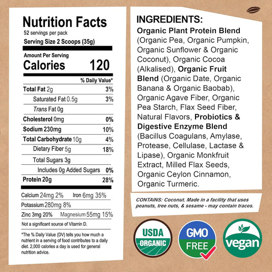EarthChimp Organic Vegan Protein Powder with Probiotics - Non GMO, Dairy Free, Plant Based Protein for Women & Men - Gluten Free Chocolate Protein Powder - 52 Servings, 64 Oz