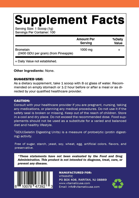 100 Grams of Vitamatic Bromelain Powder - 100 Servings, 1000mg per Serving, 2400 GDU/g, Proteolytic Enzymes for Protein DigestionVendor:VitamaticRegular price $114.74 AUDRegular priceUnit price / per-