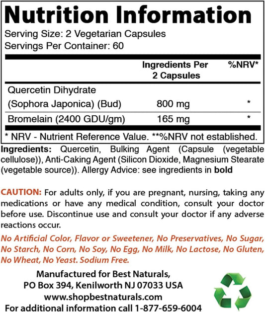 High Potency Quercetin with Bromelain Capsules - 800mg Quercetin & 165mg Bromelain (2400 GDU/g) - 120 Veg CapsVendor:Best NaturalsRegular price $112.28 AUDRegular priceUnit price / per-