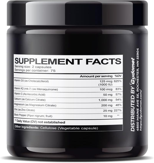 150 Capsules GUDOMET Calcium Citrate with Vitamin D3 & K2 for Bone, Muscle, & Nerve Health - High Absorption, USA-Made