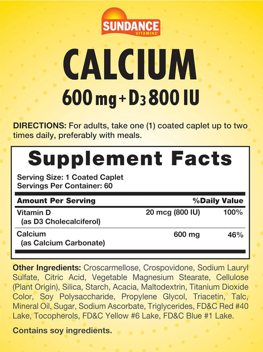 Sundance Calcium 600mg with D3 Caplets - Vegetarian, Non-GMO, Gluten Free Supplement