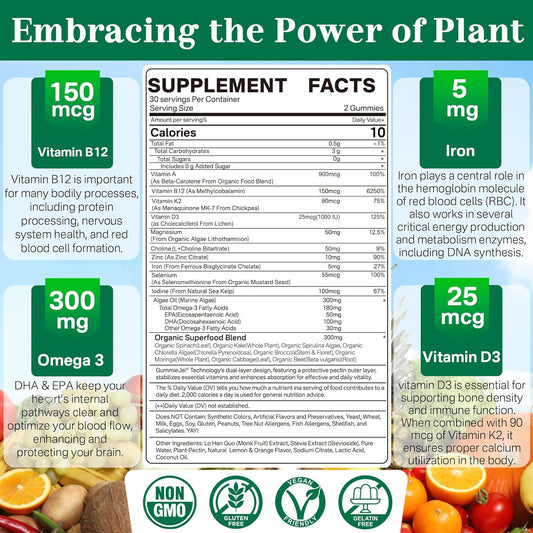 Vegan Multivitamin Gummies with Algae Calcium 600mg for Women Men - Iron, B12, A, D3, K2, Omega 3, Magnesium, Zinc