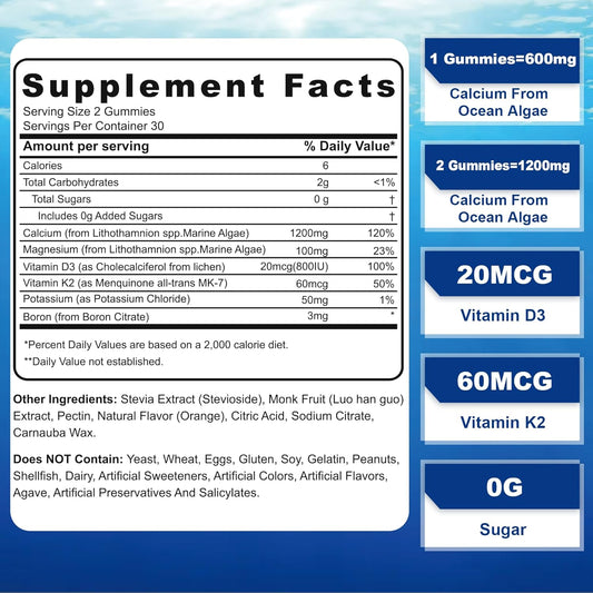 Plant Based Calcium Supplement with Vitamin D3, K2, Magnesium - 1200mg 600mg Ocean Algae Calcium - Bone Strength, Teeth Health, Muscle - Vegan Gummies, Sugar Free - 1 Pack