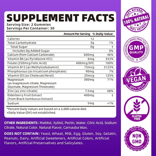 Vegan Calcium Magnesium Zinc Gummies for Women - Chewable Supplement for Bone Strength - High Absorption - Elderberry Flavor - 60 Gummies