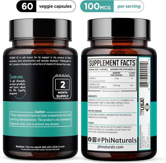 Vegan Vitamin K2 Mk7 Supplement 100mcg for Bone and Heart Health - 60 Capsules