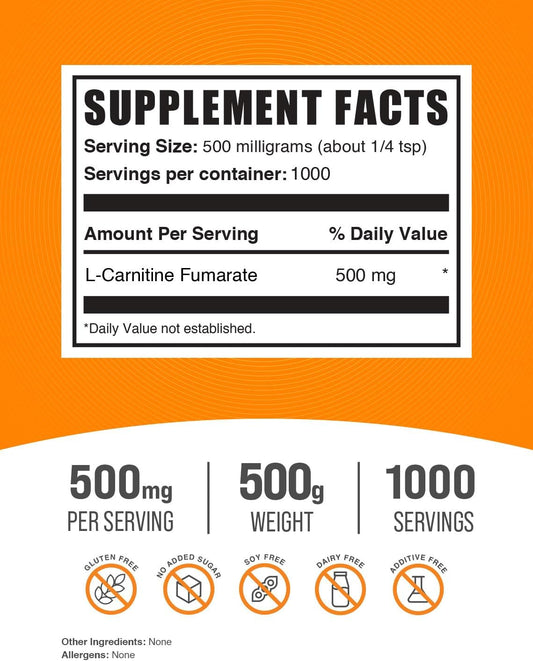 L-Carnitine Fumarate Powder - 500mg per Serving, Gluten Free Supplement - 500g (1.1 lbs) Pack of 1Vendor:BulkSupplementsRegular price $150.73 AUDRegular priceUnit price / per-