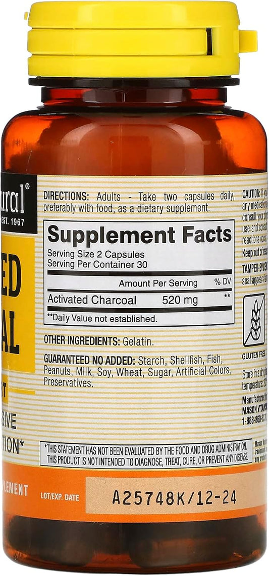 MASON NATURAL Activated Digestive Aid Vegetable Charcoal Capsules - 60 Count