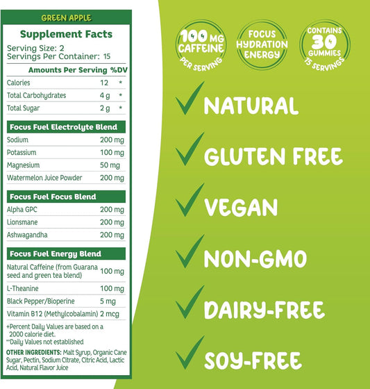 All-Natural Focus + Energy Gummies with 100mg Caffeine, B12, Magnesium, Electrolytes - Green Apple Flavor, 30 Chews