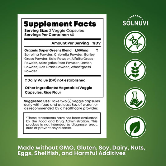 Organic Super Greens Superfood Capsules with Spirulina, Chlorella, Wheatgrass, and Kale Powder - Gut Health, Energy, and Immunity Support - 120 Vegan CapsulesVendor:SOLNUVIRegular price $143.18 AUDRegular priceUnit price / per-
