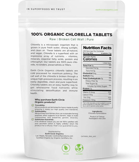 Earth Circle Organics Organic Chlorella Tablets - High Potency Superfood Supplement with Pure Green Algae, Rich in Protein and Iron - 2000 Tablets Total, Vegan and Kosher-Friendly