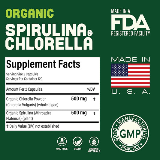 Organic Plant-Bae Spirulina & Chlorella Capsules for Detox - 240 Count - Made in USA - Boosts Energy Levels - Rich in Antioxidants
