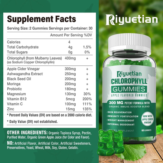 Riyuetian Vegan Chlorophyll Gummies with ACV, Sea Moss, Elderberry, Echinacea - Energy Boost, Immune Support, Natural Deodorant - 60 GummiesVendor:RiyuetianRegular price $109.81 AUDRegular priceUnit price / per-