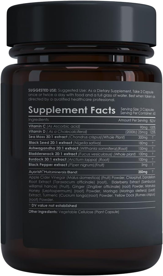 Sea Moss Capsules with Black Seed Oil, Ashwagandha, Bladderwrack, Burdock, Vitamin C & D3, Elderberry, Manuka, Dandelion, Yellow Dock, Chlorophyll, ACV, Moringa, and Ginger - 120 CountVendor:AyorishRegular price $108.33 AUDRegular priceUnit price / per-