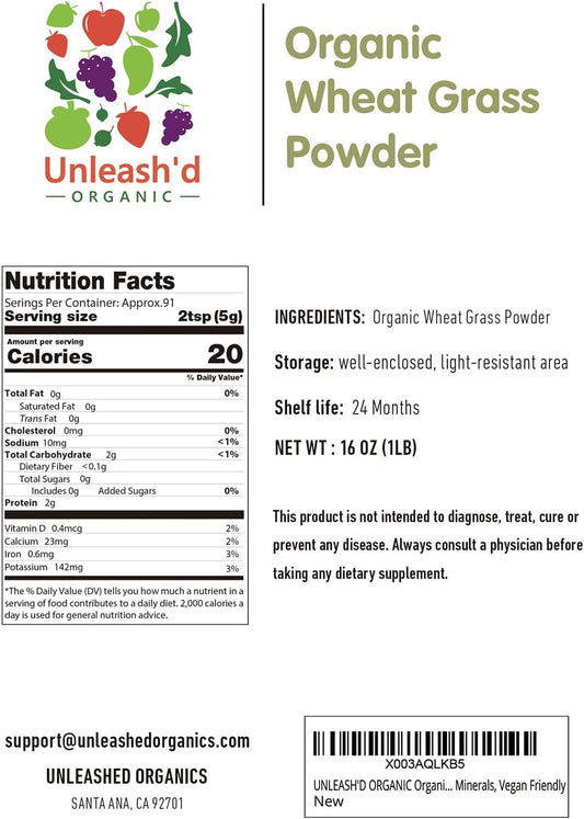 100% Pure & Organic UNLEASH'D Barley Grass Powder - 1 Pound Superfood Greens with Vitamins, Minerals, Fibers, Antioxidants