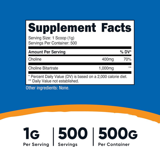 500G Nutricost Pure Choline Bitartrate Powder - Pack of 2 Bottles