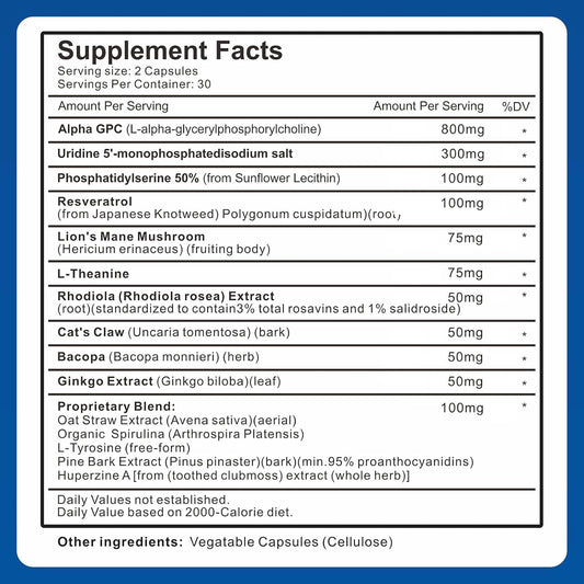 15-in-1 Alpha GPC Nootropic Brain Supplement with Lion's Mane - Memory, Focus, and Brain Support - 60 Capsules