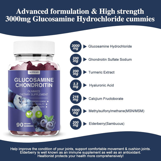 Extra Strength Glucosamine Chondroitin Gummies with MSM & Elderberry for Joint and Immune Support - 90 Blueberry Gummies for Adults