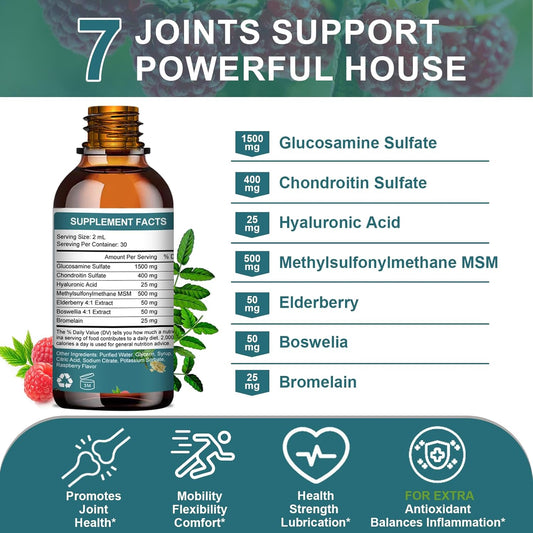 Extra Strength Liquid Joint Support Supplement with Glucosamine, Chondroitin, MSM, Elderberry, Boswelia, Bromelain, and Hyaluronic Acid - Antioxidant Immune Support for Adults, Men & Women - 2 Fl oz