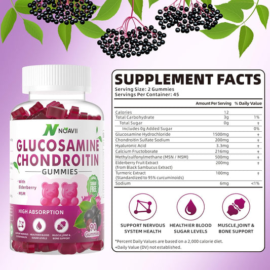 Extra Strength NutriVigor Glucosamine Chondroitin Gummies with MSM & Elderberry for Joint Support - 120 Count, Blueberry Flavor - Men & Women's Supplement