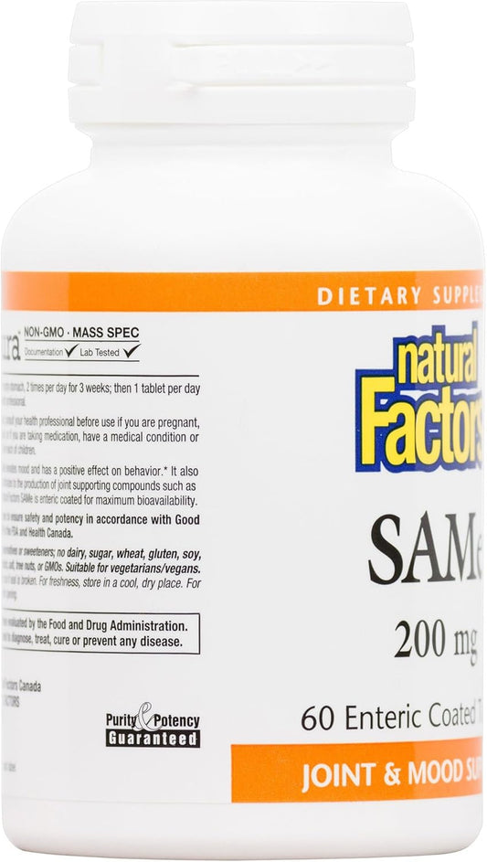 Natural Factors SAMe 200mg Tablets for Mood Elevation and Joint Health - 60 Servings