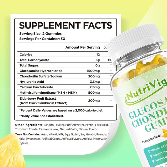 Extra Strength NutriVigor Glucosamine Chondroitin Gummies with MSM & Elderberry - 60 Count, Pineapple Flavor, Antioxidant Immune Support for Adults