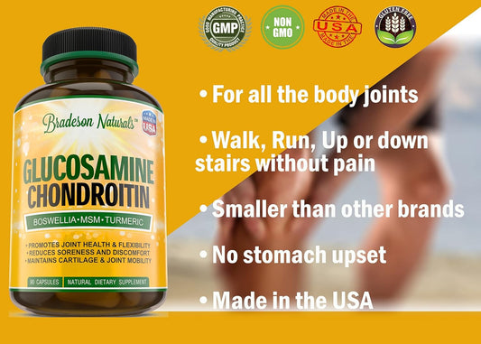 Natural Joint Health Supplement with Glucosamine, Chondroitin, Turmeric, MSM, Boswellia, Bromelain & Quercetin - 90 Capsules - Made in USA