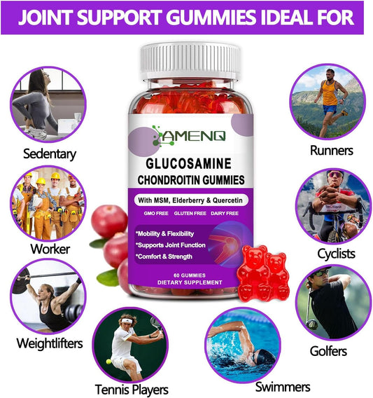 AMENQ Extra Strength Glucosamine Chondroitin Gummies with MSM, Hyaluronic Acid & Collagen for Joint Support - 60ct Flexibility & Joint Health Supplement for Men and Women