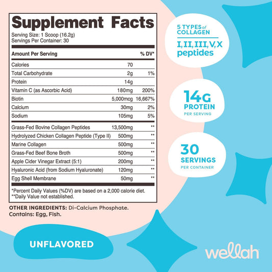 Wellah Afterglow Multi Collagen Protein + Beauty - Hair, Skin, Nail & Joint Support (30 Servings, Unflavored) - Non-GMO, Gluten Free