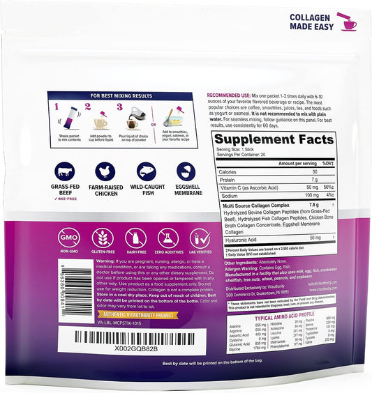 Vitauthority Multi Collagen Peptides with Hyaluronic Acid, Vitamin C - 20 Stick Packs - Unflavored